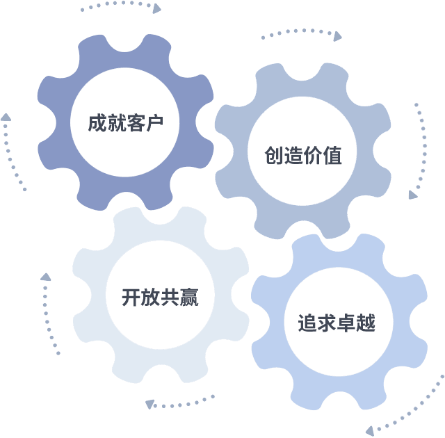成就客户是一切决策的出发点,,,创造价值是衡量所有工作的标准,,追求卓越是我们做事做人的态度,,开放共赢是我们的格局也是最终的结果。。。。价值观的齿轮环环相扣,,,推动着组织里的每个人不断向前。。。。